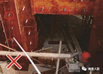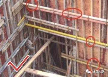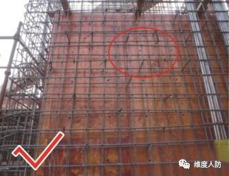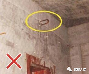 《人民防空工程質(zhì)量驗(yàn)收與評(píng)價(jià)標(biāo)準(zhǔn)》(RFJ01-2015) 第 6.4.2 條:外墻、臨空墻、門框墻、防護(hù)密閉隔墻和密閉隔墻的模板安裝,其固定模板的對(duì)拉螺栓上嚴(yán)禁采用套管、混凝土預(yù)制件等。