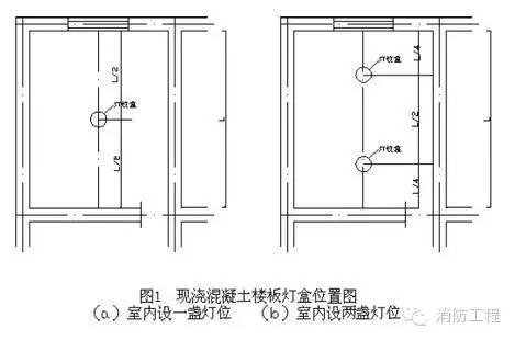 ⑴在配管前應(yīng)按設(shè)計(jì)圖紙確定好配電設(shè)備、各種箱、盒及用電設(shè)備位置。在樓板內(nèi)配管時(shí),在土建摸板支設(shè)完畢后,根據(jù)設(shè)計(jì)圖紙?jiān)诿迳嫌眉t油漆標(biāo)注燈具、插座、探測器、接線盒、配電箱的位置。當(dāng)室內(nèi)只有一盞燈時(shí),其燈位盒應(yīng)設(shè)在縱橫墻(或梁)凈尺寸中心線的交叉處;有兩盞燈時(shí),燈位盒應(yīng)設(shè)在短軸線墻(或梁)凈尺寸中心線與長軸線墻(或梁)凈尺寸1/4 的交叉處,如圖1 所示。公共建筑走廊照明燈具,應(yīng)按其頂部建筑結(jié)構(gòu)不同,來合理地布置燈位盒的位置,當(dāng)走廊頂部無凸出樓板下部的梁時(shí),除考慮好樓梯對(duì)應(yīng)處的燈位盒外,其他燈位盒宜沿走廊中心線均勻分布,如走廊頂部有凸出樓板下部的梁,確定燈位時(shí),應(yīng)考慮到燈位與梁的位置關(guān)系,燈位盒與梁之間的距離應(yīng)協(xié)調(diào),均勻一致,力求實(shí)用美觀。