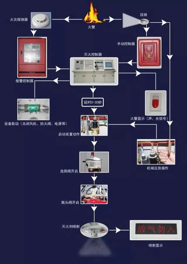 將滅火控制器上的控制方式選擇鍵撥至“自動”位置,滅火系統(tǒng)則處于自動控制狀態(tài)。當保護區(qū)發(fā)生火情時,火災(zāi)探測器發(fā)出火災(zāi)信號,經(jīng)報警控制器確認后,滅火控制器即發(fā)出聲、光報警信號,同時發(fā)出聯(lián)動指令,相關(guān)設(shè)備聯(lián)動,經(jīng)過一段延時時間,發(fā)出滅火指令,打開電磁瓶頭閥釋放啟動氣體,啟動氣體通過啟動管路打開相應(yīng)的選擇閥和瓶頭閥,釋放滅火劑,實施滅火。