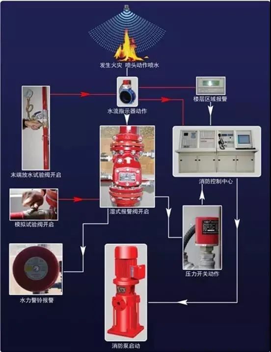 保護區(qū)域內(nèi)發(fā)生火災(zāi)時,溫度升高使閉式噴頭玻璃球炸裂而使噴頭開啟噴水。這時濕式報警閥系統(tǒng)側(cè)壓力降低,供水壓力大于系統(tǒng)側(cè)壓力(產(chǎn)生壓差),使閥瓣打開(濕式報警閥開啟),其中一路壓力水流向灑水噴頭,對保護區(qū)灑水滅火,同時水流指示器報告起火區(qū)域;另一路壓力水通過延遲器流向水力警鈴,發(fā)出持續(xù)鈴聲報警,報警閥組或穩(wěn)壓泵的壓力開關(guān)輸出啟動供水泵信號,完成系統(tǒng)啟動。系統(tǒng)啟動后,由供水泵向開放的噴頭供水,開放噴頭按不低于設(shè)計規(guī)定的噴水強度均勻噴水,實施滅火。