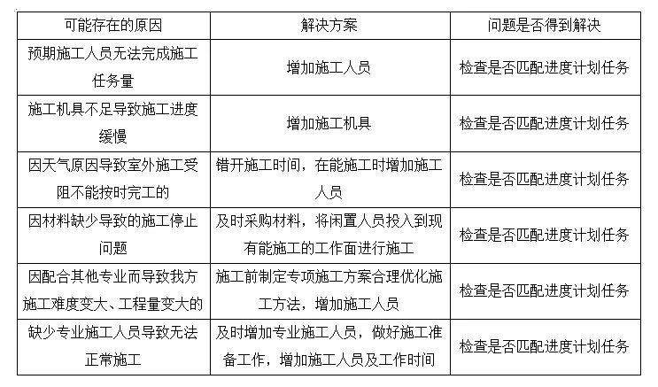 在施工之前應(yīng)制定月、周施工進度計劃表,規(guī)定其施工節(jié)點日期,管理人員應(yīng)對照進度計劃表檢查相對應(yīng)的節(jié)點檢及施工進度是否與計劃表相對應(yīng),如不符合計劃進度表有偏離的應(yīng)找出問題所在,匹配原進度計劃表完成計劃任務(wù)。