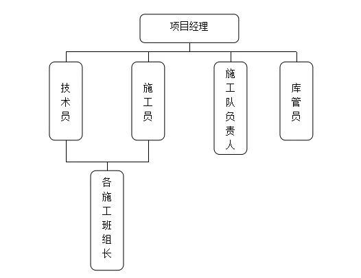 項(xiàng)目部應(yīng)設(shè)置項(xiàng)目經(jīng)理、技術(shù)員、安全員、庫管員等人員。具體組織機(jī)構(gòu)如下圖: