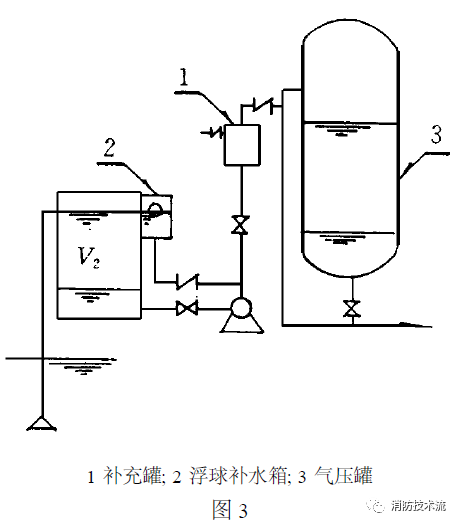 如圖三所示, 當(dāng)補(bǔ)氣罐及水泵出水管上止回閥以前的管道水容積較小時(shí)(小于真空罐容積V2時(shí))停泵后,在補(bǔ)氣罐補(bǔ)氣過(guò)程中,外界空氣有可能進(jìn)入真空罐,破壞了真空度,待下次啟泵時(shí)不出水。這種情況在實(shí)際工程中曾發(fā)生過(guò),后將補(bǔ)氣罐容積加大而解決。解決方法可適當(dāng)加大補(bǔ)氣罐容積或增加一個(gè)浮球式補(bǔ)水箱。