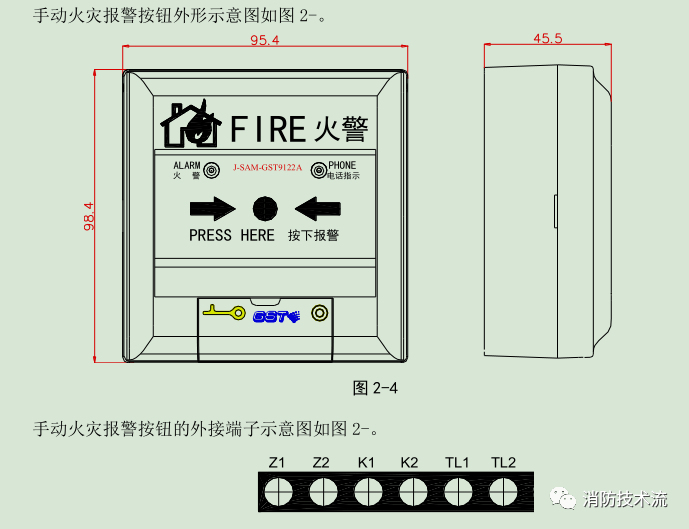 K1、K2:額定 DC30V/100mA 無源輸出端子,當(dāng)報警按鈕按下時,輸出觸點閉合信號,可直接控制外部設(shè)備。
