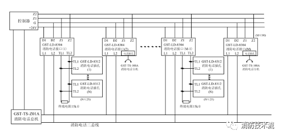 布線要求:信號 Z1、Z2 采用阻燃 RVS 雙絞線,截面積≥1.0mm2 ;消防電話線 TL1、TL2 采用阻燃 RVVP 屏蔽線,截面積≥1.0mm2 。