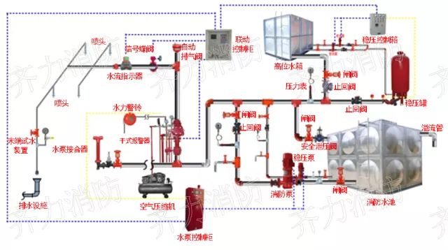 1)開啟最不利處末端試水裝置控制閥,查看水流指示器、壓力開關和消防水泵、電動閥的動作情況及反饋信號,以及排氣閥的排氣情況。